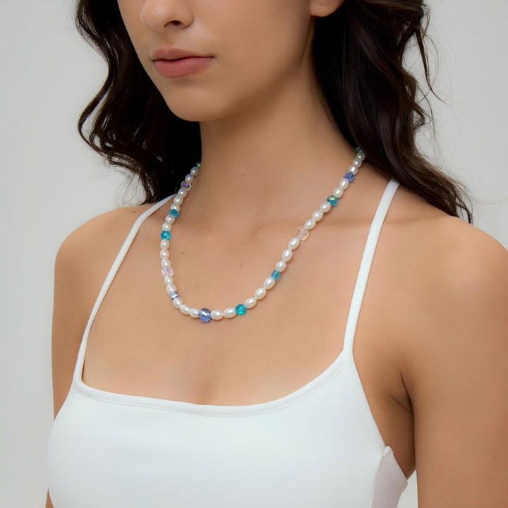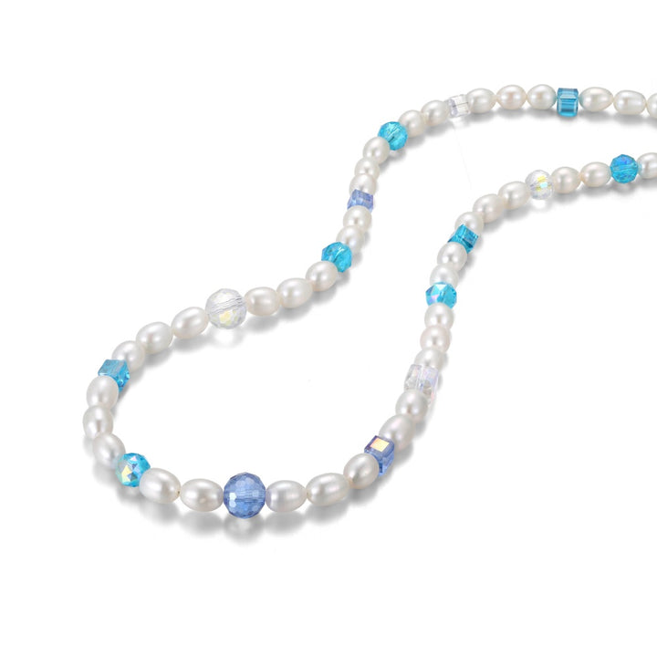 Rice-shaped pearl necklace featuring 7.0–7.5mm freshwater pearls.