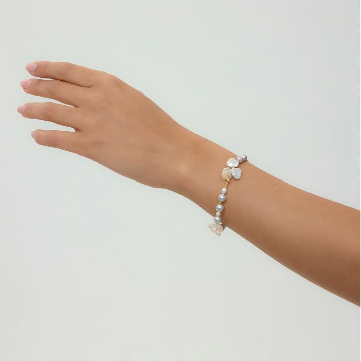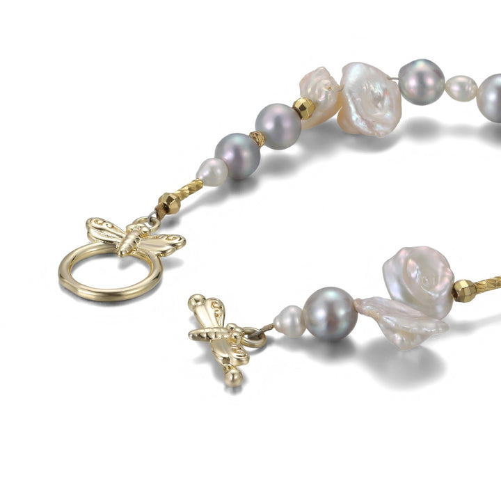 Hand-strung bracelet featuring silver-blue petal, natural Akoya and teardrop pearls in 3–8mm.