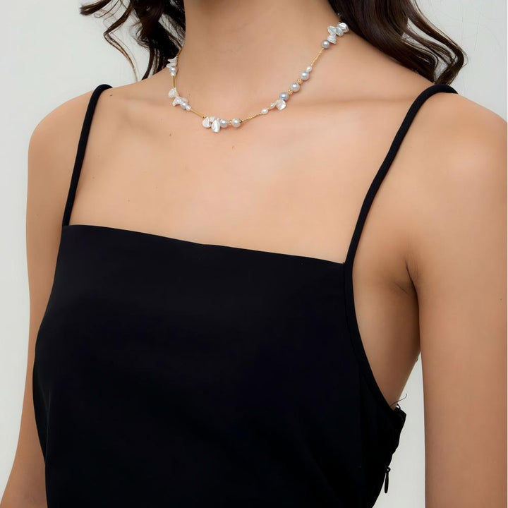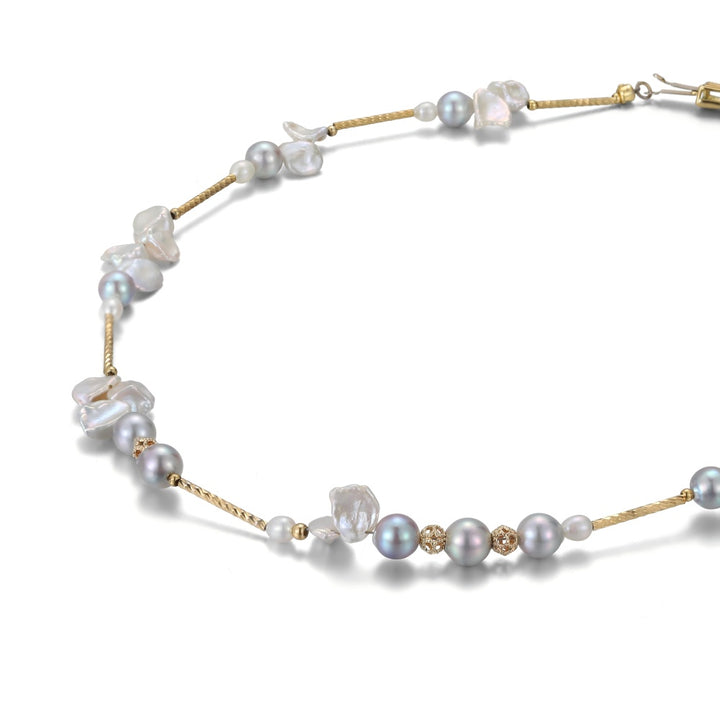 Pearl necklace featuring silver-blue petal, natural Akoya and teardrop pearls in 3–8mm.