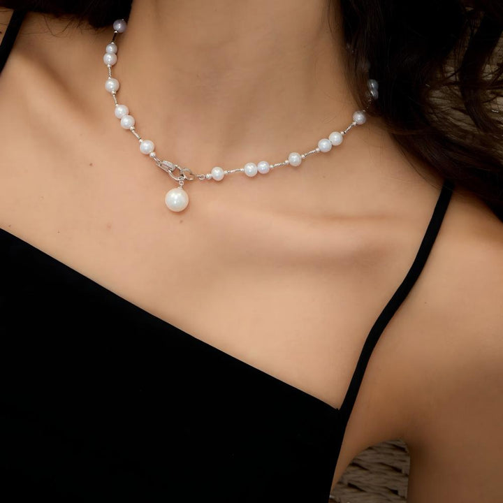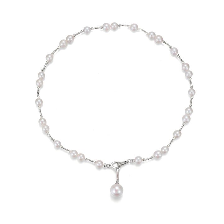Heart-shaped clasp necklace with a detachable pearl pendant on 7–7.5mm freshwater pearls.