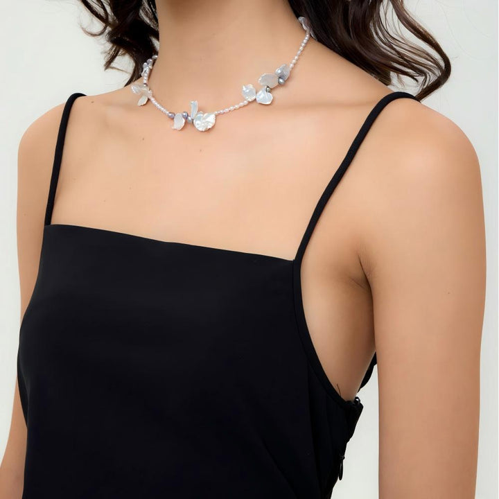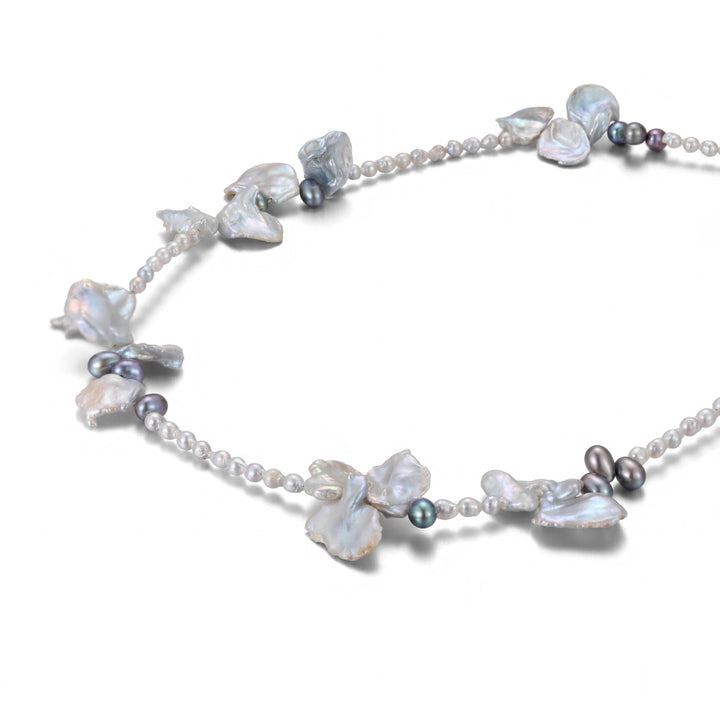 Silver-lavender pearl necklace featuring petal, rice and keshi pearls in 3.5–12mm.